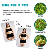 Hormonal imbalance, poor digestion, and slow metabolism cause fat storage and stubborn weight gain. | Methi speeds up metabolism and aids fat breakdown. Nagarmoth enhances fat metabolism & supports weight loss. Amla improves digestion and gut health, preventing fat accumulation. |