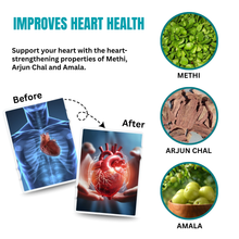 Unhealthy lifestyle, stress, and high cholesterol weaken the heart, leading to poor circulation, hypertension, and heart disease. | Arjun Chaal strengthens heart muscles, improves blood flow, reduces cholesterol & BP. Methi lowers LDL (bad) cholesterol, protecting arteries. Amla reduces cholesterol, improves circulation & prevents heart damage. |